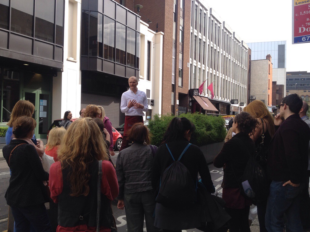 Thankfully, the rain shower that did appear had the good manners to start and finish while we were chowing down. Dry skies and sunshine returning, we went for a potter the long way round to the Market Bar, misled by some of us (OK, me… ‘Follow the brolly!’), and returned to the right route by our unflappable Trail guide, Paul.