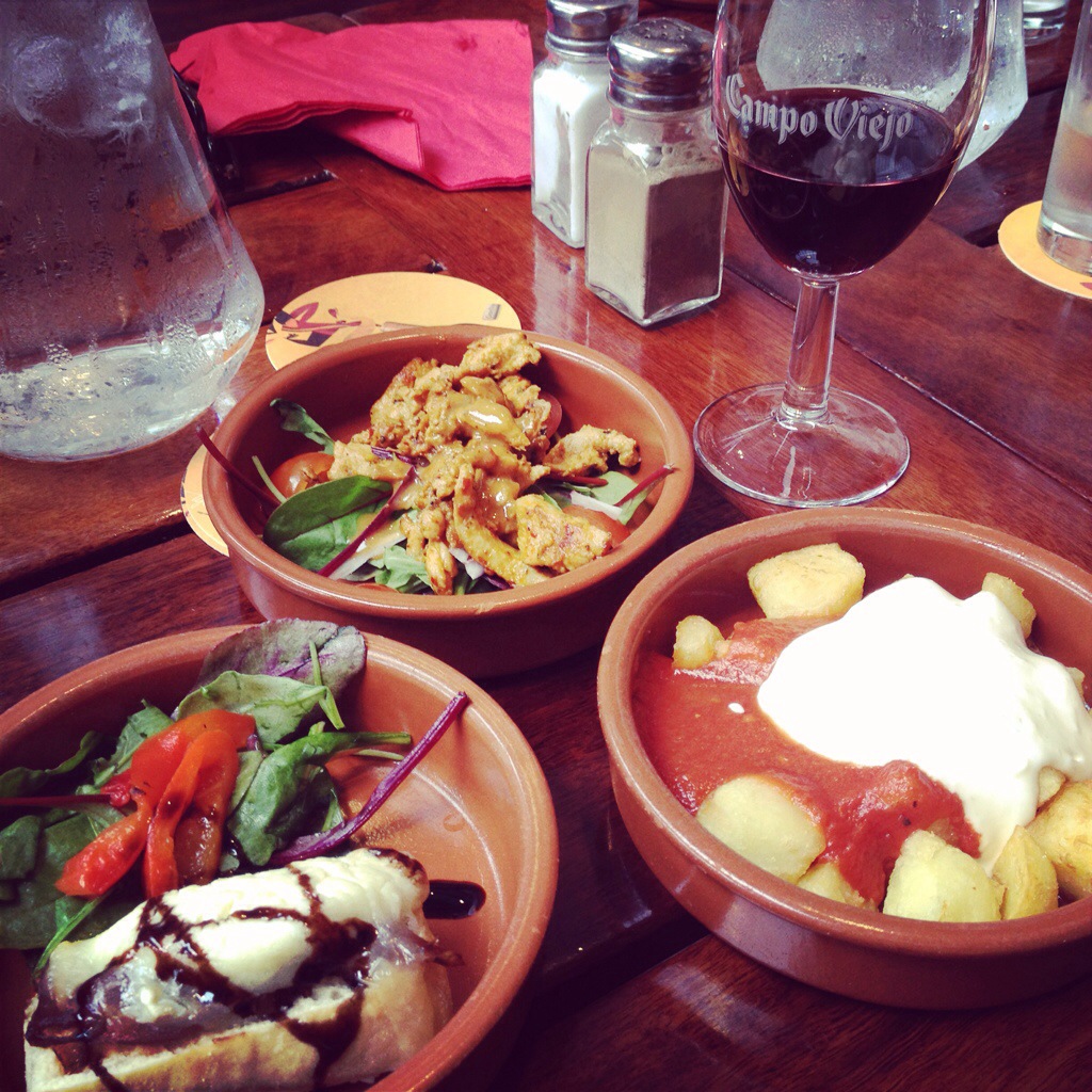 Well, no chance of us going hungry here. Piri Piri Chicken Salad, Patatas Bravas and to-die-for Goats Cheese Crostini. Oh, and another glass of Campo Viejo Reserva. Woo and indeed, hoo!