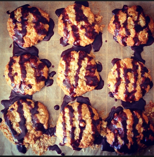 Using a spoon, drizzle over the cookies. The closer the spoon is to the cookies, the better.