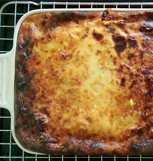 If you’re going to follow the original recipe, make sure you have a good deep dish for this. I ended up throwing out some of the béchamel sauce and not doing a third layer because my dish (height about 12cm/ 5in) was too shallow. The other proportions were fine, 24 x 35cm. Not a huge waste as there was plenty of sauce on top, but if you want to be exact, a deeper dish is better. I feel you’d still need a second aubergine than given in the original recipe also to make the extra layer.